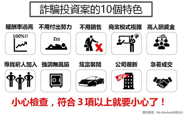 承諾「每月固定報酬」、「穩賺不賠」、「內線消息」,都是騙人的。投資一定有風險,任何人說保證賺錢都是在騙你。